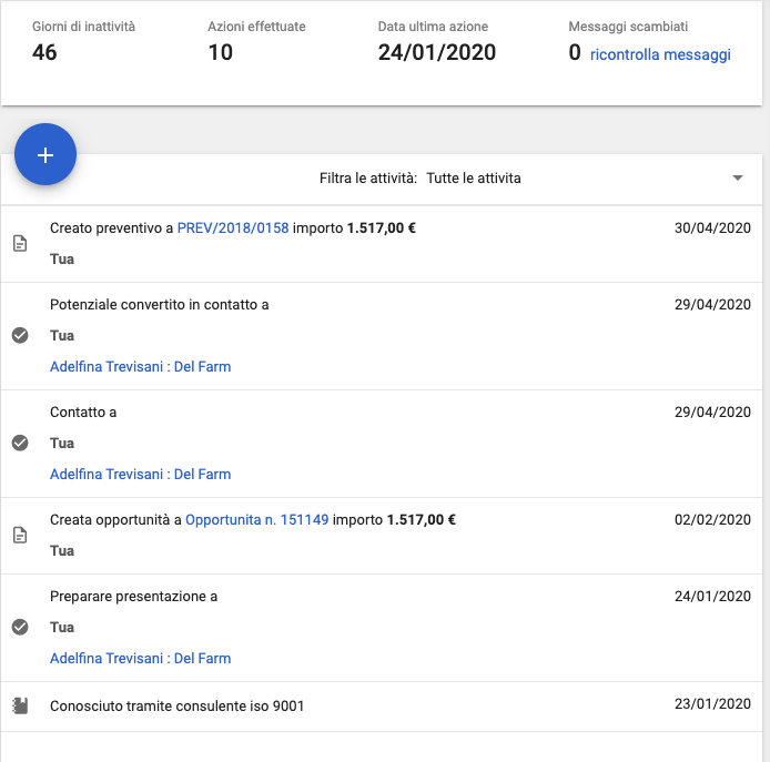 Sempre nella scheda centrale, Selly Erp elenca la cronologia di tutte le attività fatte nel tempo e tutte le email scambiate con la persone.