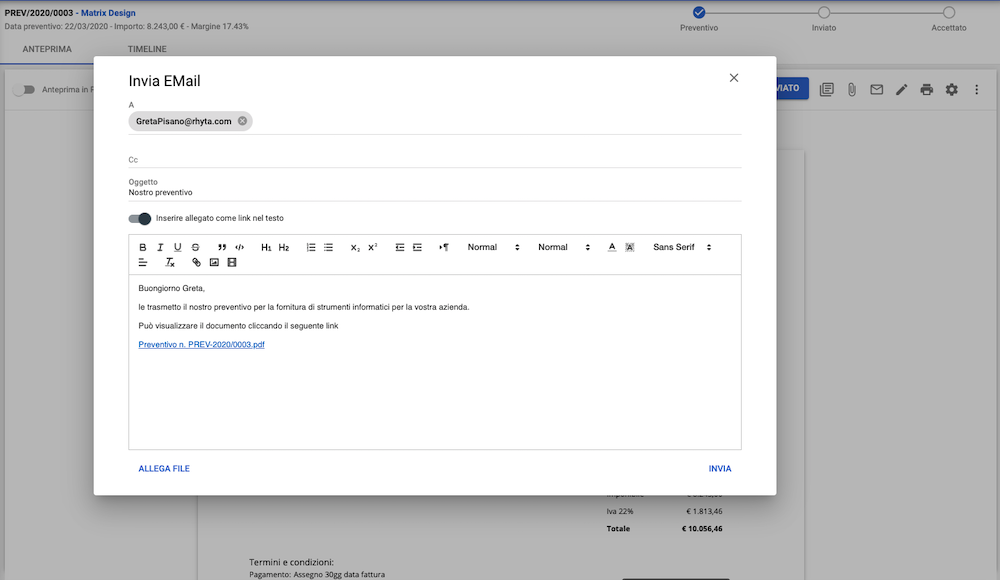 Cliccando sull'apposita icona, si apre la finestra per l'invio della mail con il preventivo. Il sistema inserisce automaticamente la mail del destinatario, e utilizzando la funzione "inserire allegato come link nel testo" verrà inviata la mail con il link di apertura del documento.