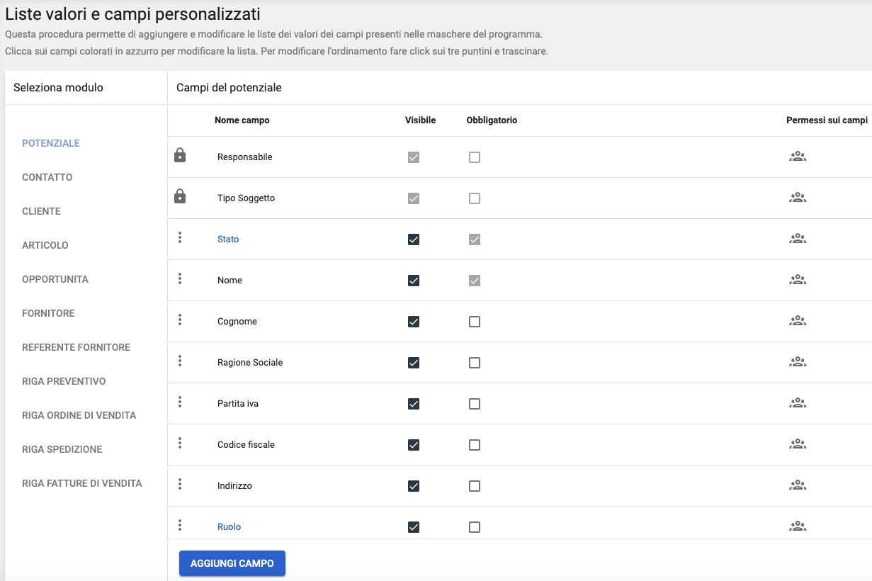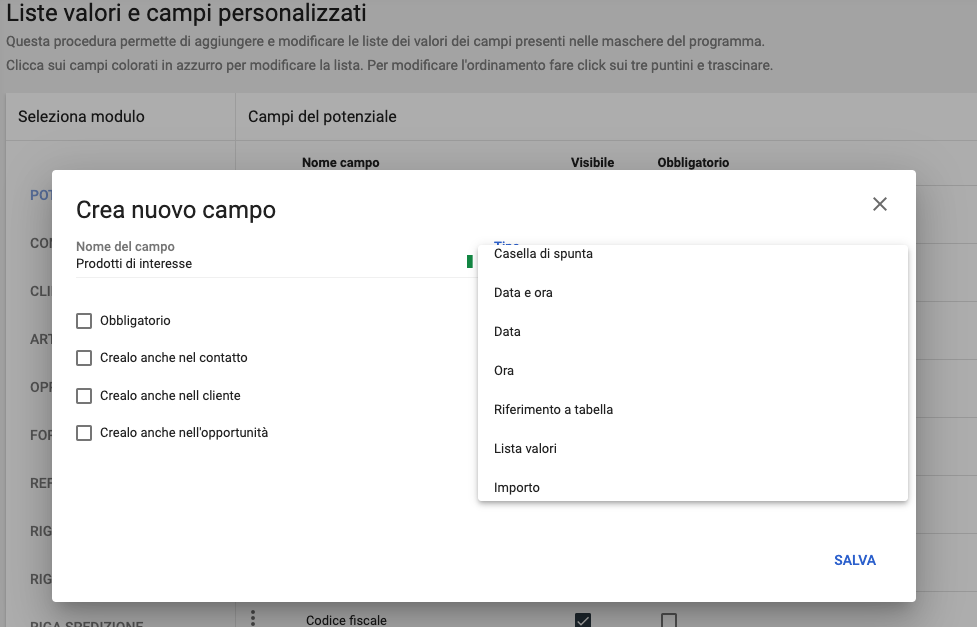 Per la creazione di un nuovo campo cliccare sul pulsante AGGIUNGI CAMPO, inserire il nome del campo, definire la tipologia di dato che si desidera inserire nel nuovo campo (Testo, data, casella di spunta, liste di valori, numeri, indirizzi ecc)