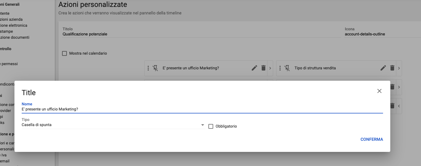 Per creare un'azione personalizzata è dunque sufficiente accedere alla procedura dal menù di configurazione, cliccare su AGGIUNGI AZIONE e inserire i campi desiderati, in modo similare a quanto viso nella sezione liste valori e campi personalizzati.