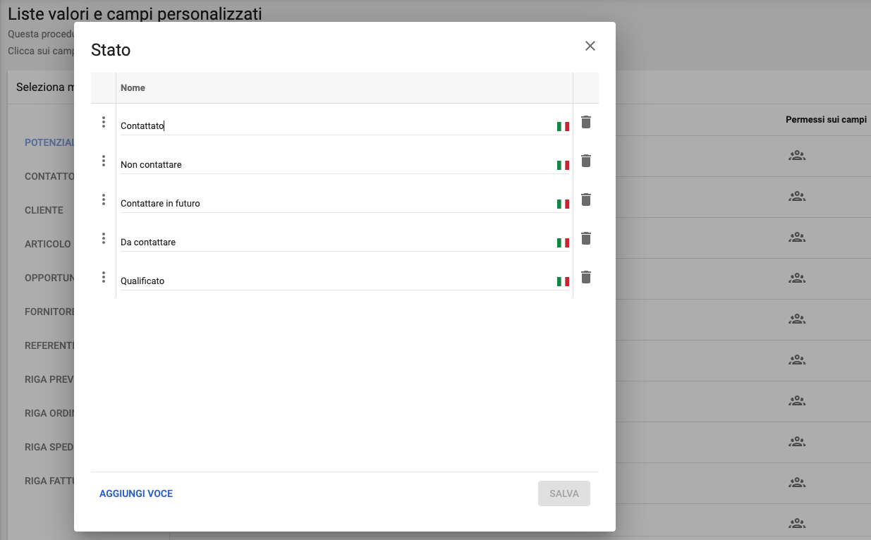 Quando un campo di sistema prevede una lista di valori, sarà sufficiente cliccare sul nome del campo per modificare i valori della lista.