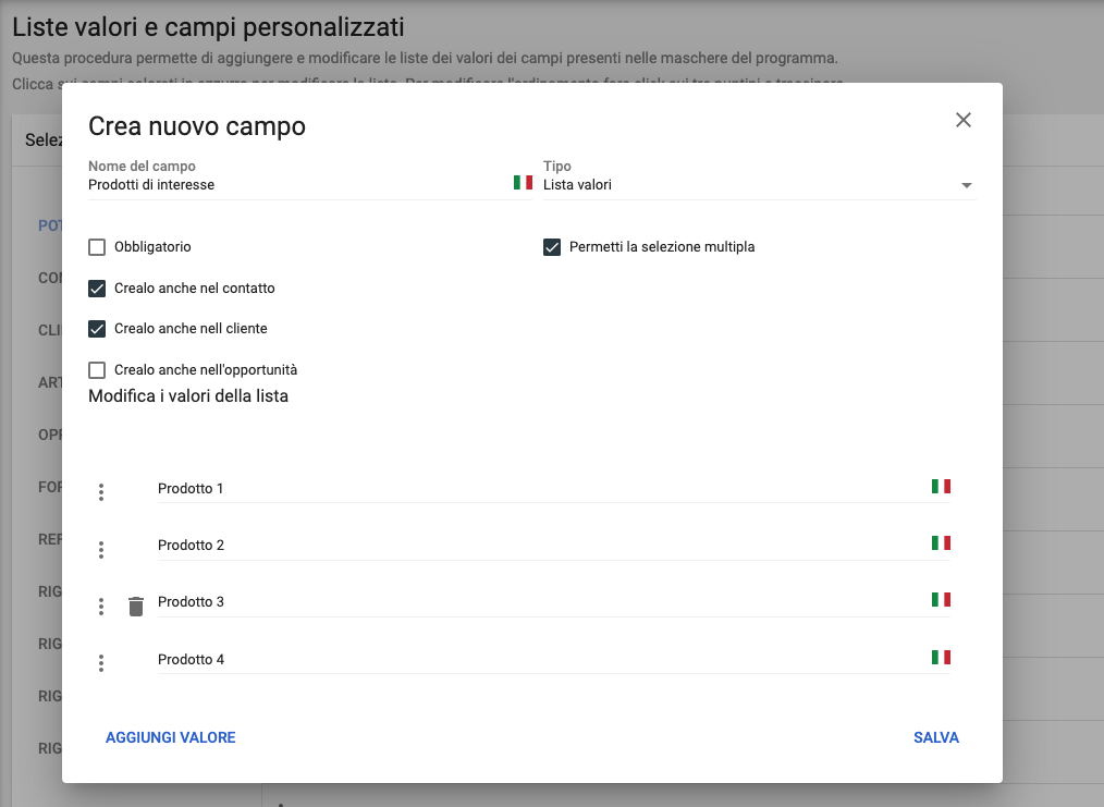 Completare le impostazioni selezionando le opzioni presenti nella maschera. Tra queste la possibilità di selezionare più di un valore presente nella lista (multi-selezione), se rendere il campo obbligatorio o meno, se il campo dev'essere creato anche nelle tabelle dei Contatti, Cliente, Opportunità.