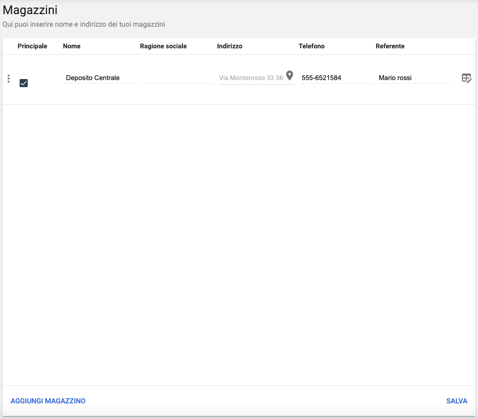 Dal menù di configurazione, selezionare la procedura Magazzini e cliccare su AGGIUNGI MAGAZZINO. Definire un nome del magazzino, se il magazzino si trova presso una società terza, indicare la ragione sociale, impostare l'indirizzo del magazzino, un numero di telefono e un referente.