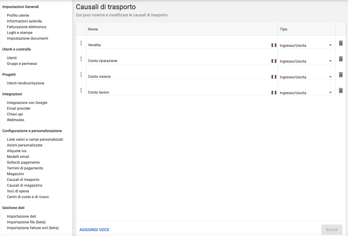 Oltre alle causali predefinite è possibile creare nuove causali e specificare per ognuna il tipo di operazione prevista nel magazzino, ovvero:
