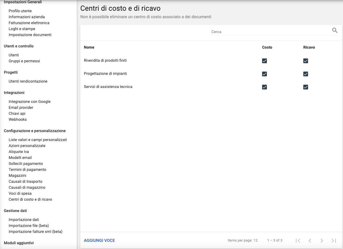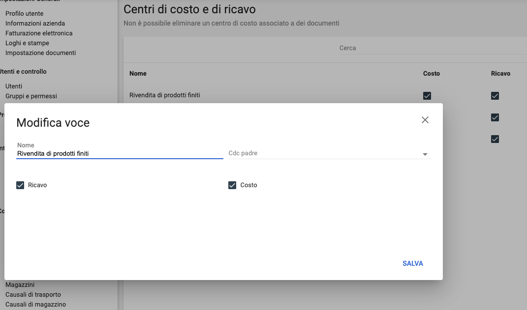 Dal menù di configurazione, selezionare la voce centro di costo e di ricavo, cliccare su AGGIUNGI VOCE e inserire il nome, quindi spuntare la casella RICAVO / COSTO o entrambi per abilitare in seguito la possibilità di associare costi e/o ricavi al centro appena inserito.