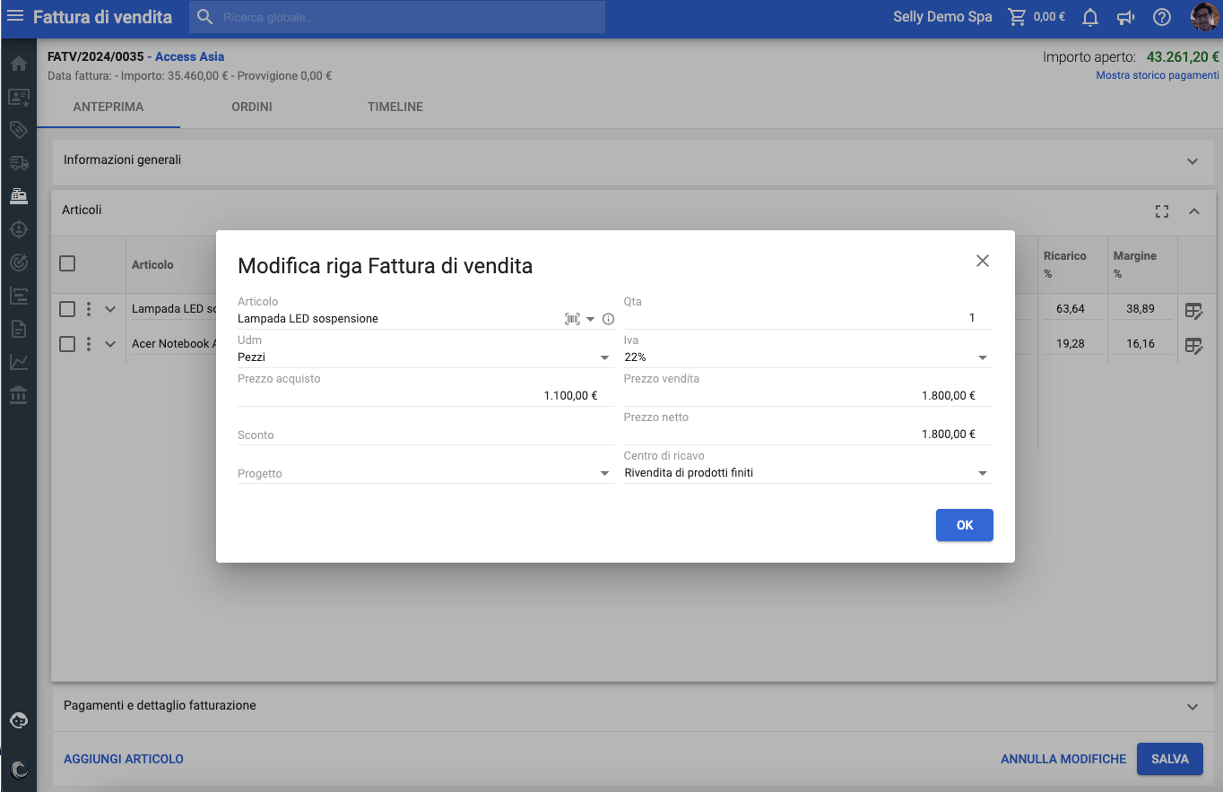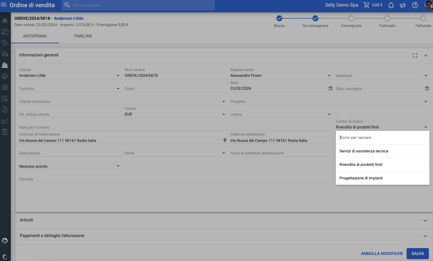 Per associare un ricavo al centro di ricavo è sufficiente entrare in modifica del documento ordine o fattura di vendita, cliccare nel campo centro di ricavo e selezionare la voce.