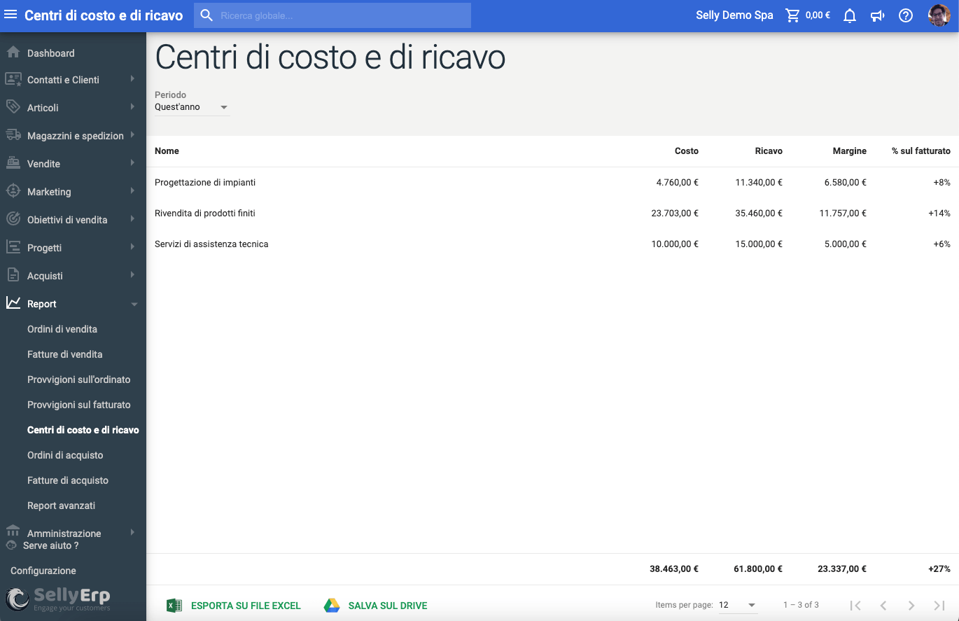 Una volta inseriti i dati nelle transazioni del sistema, come indicato nei paragrafi precedenti, sarà possibile visualizzare un riepilogo dei costi, e dei ricavi per centro, utilizzando la procedura Report Centri di costo e di ricavo.