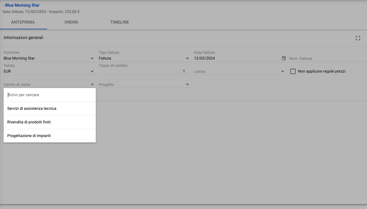 Entrando in modifica della fattura fornitore, nella sezione Informazioni generali, troviamo il campo Centro di costo, cliccando verrà visualizzato l'elenco delle voci create al punto precedente.