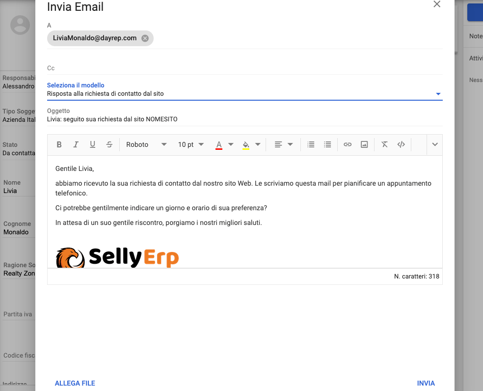 Nella videata sopra abbiamo inserito il segnaposto che contiene il nome del referente cliente e la firma dell'utente che invierà il messaggio.