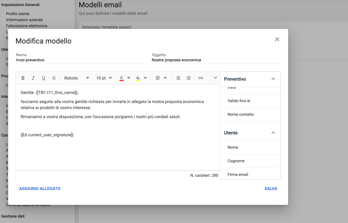 Si clicca su NUOVO MODELLO, si inserisce il nome del modello email (es. invio preventivo) quindi l'oggetto della mail. All'interno dell'editor di testo si potrà inserire il testo completo del messaggio e utilizzando la funzione dei segnaposto, si potrà personalizzare il messaggio con i dati presenti nel sistema.