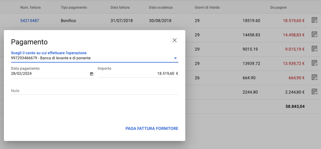 Per registrare il pagamento della fattura è sufficiente cliccare l'icona che si trova vicino all'importo aperto, selezionare il conto bancario e la data dell'operazione, confermare l'importo o inserire l'effettivo importo pagato.