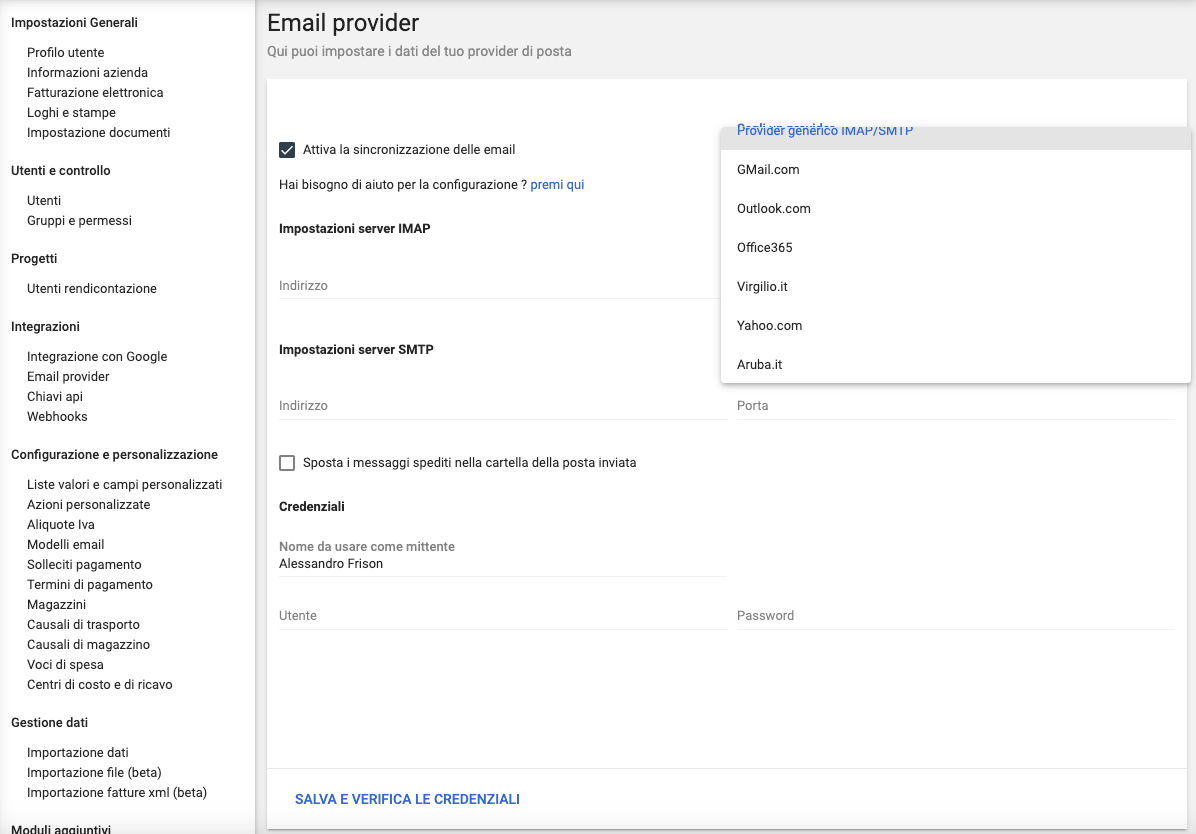Dal menù configurazione, sotto la sezione Integrazioni, selezionare la voce Email provider