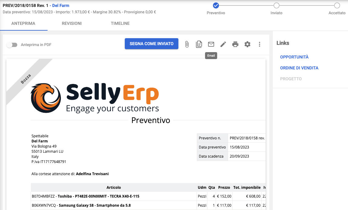 La funzione di invio email è disponibile su tutti i documenti di Selly Erp. Sarà dunque sufficiente entrare in un documento, cliccare sull'icona busta email per inviare il messaggio direttamente da Selly Erp.