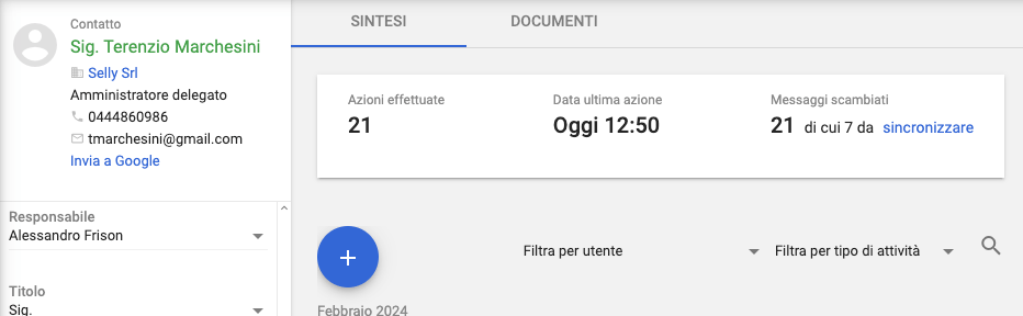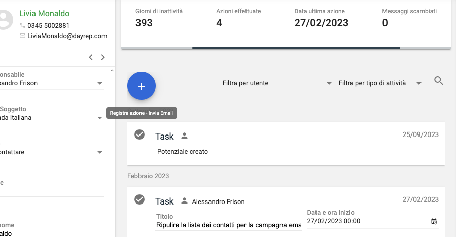 Entrare nella scheda di un potenziale / contatto e cliccare il pulsante + presente nella sezione centrale.