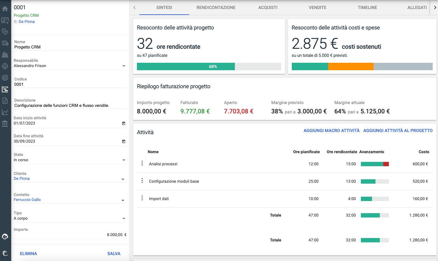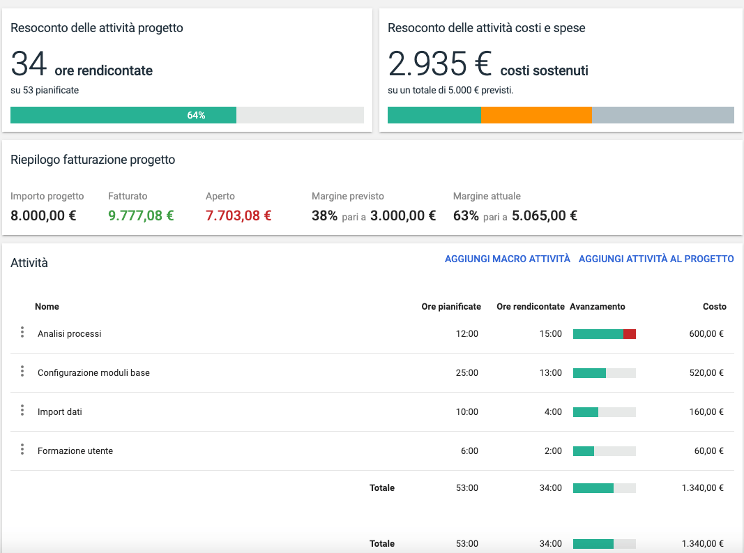 La scheda iniziale contiene tutte le informazioni rilevanti del progetto, una panoramica immediata delle attività pianificate, dei tempi previsti e di quelli finora eseguiti, eventuali scostamenti rispetto al budget previsto, la marginalità attuale del progetto, tutti i costi sostenuti e tutti i tempi delle attività rendicontate.