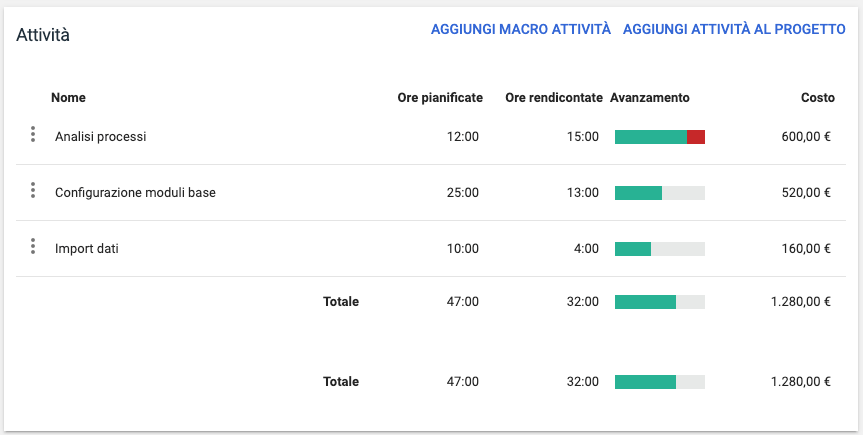 Nel pannello delle attività vengono indicati i tempi rendicontati per ogni attività, l'avanzamento in percentuale ed eventuali scostamenti, il totale delle ore di attività e relativo costo.