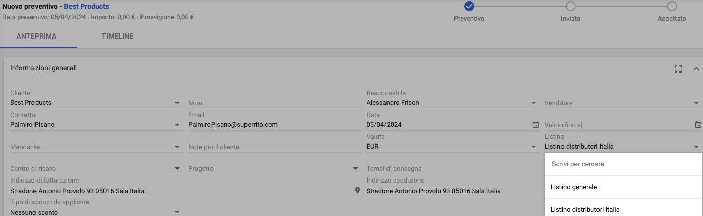Nel caso in cui non sia stato associato il listino al cliente, quando si crea un nuovo documento (preventivo, ordine, fattura) nella sezione Informazioni generali è presente il campo Listino.