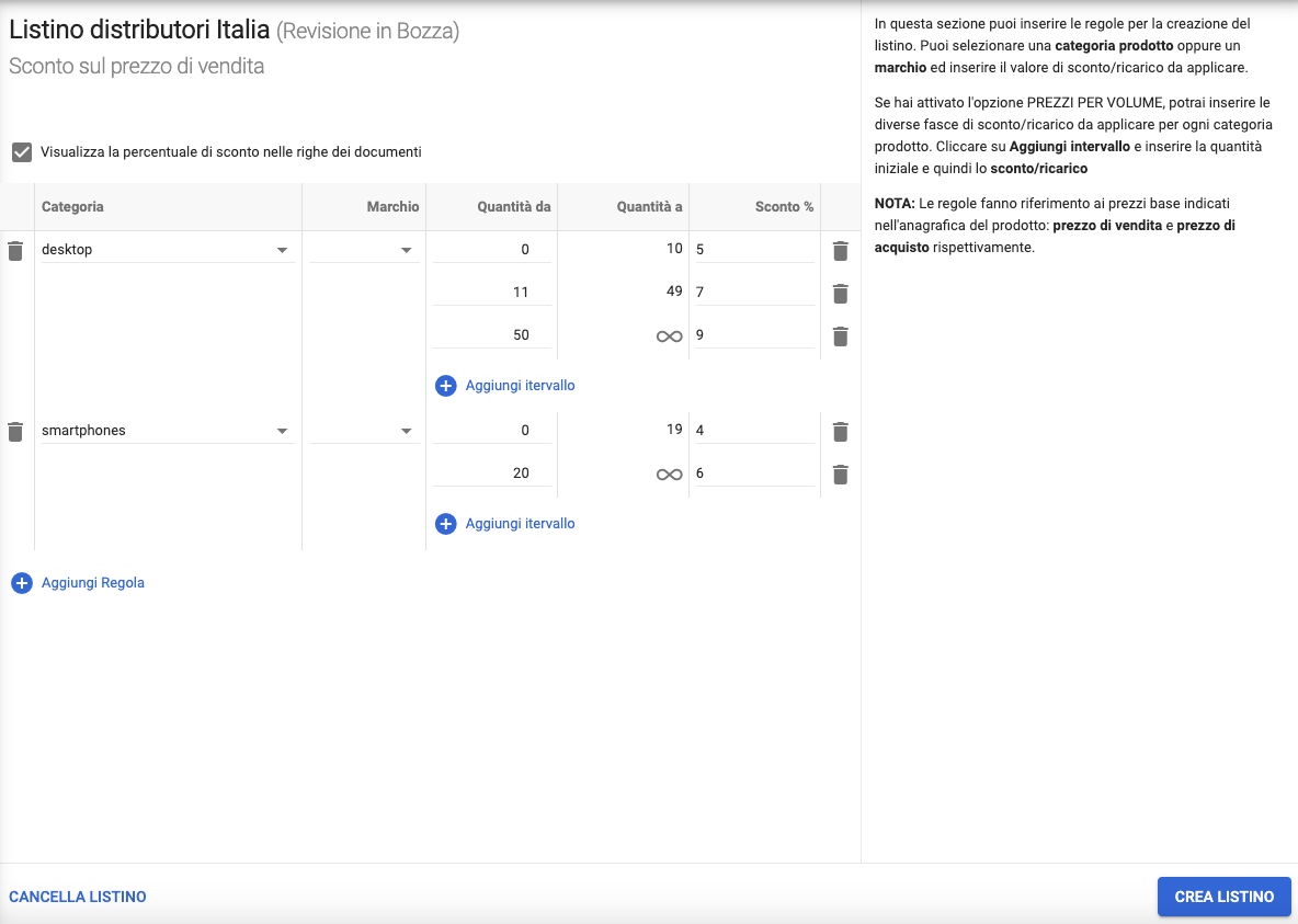 In questo modo si possono definire le regole di sconto per quantità per tutte le categorie prodotto e/o marchio da inserire nel nuovo listino.
