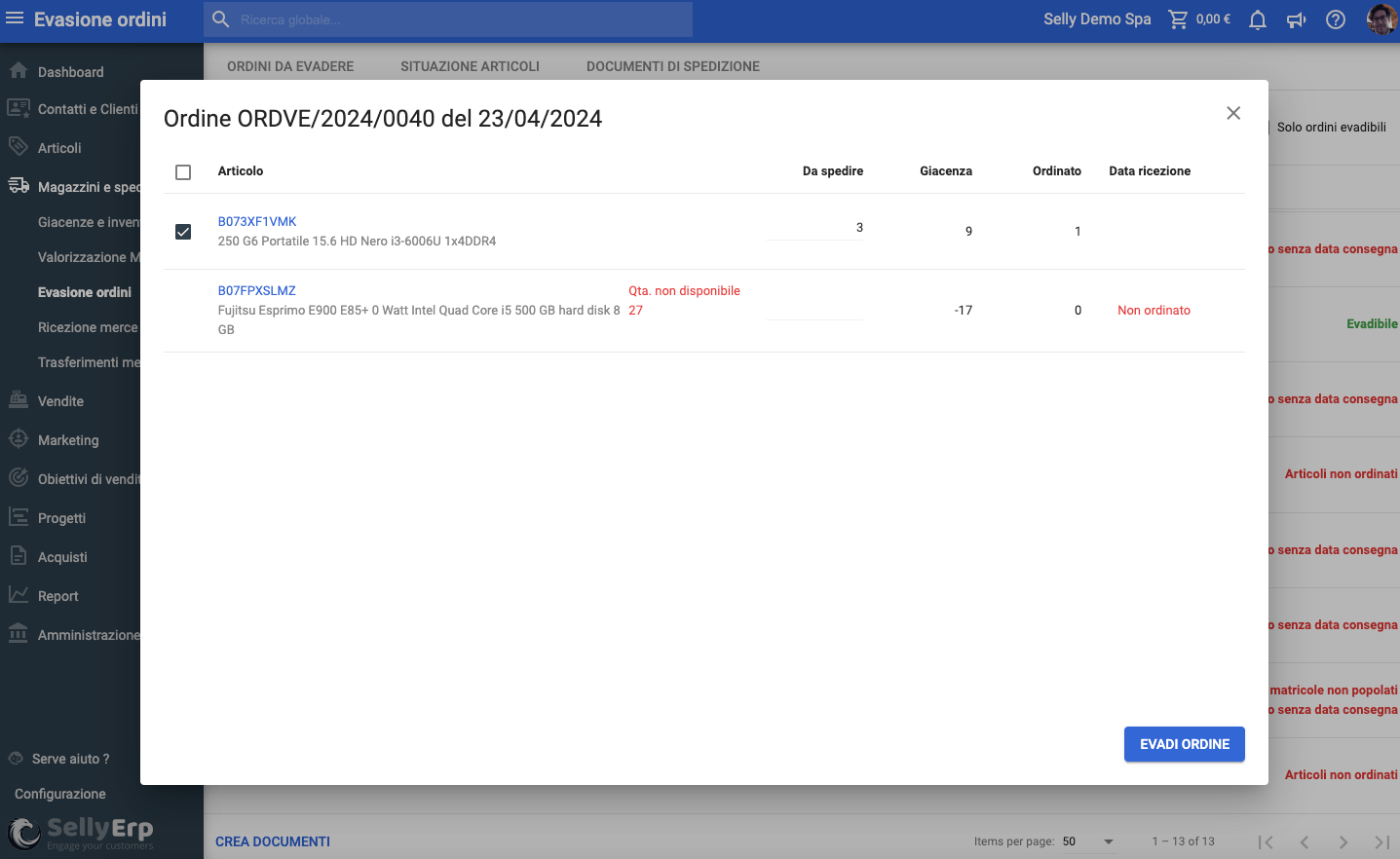 La procedura consente la generazione di spedizioni parziali di un ordine di vendita. E' sufficiente cliccare sul numero di ordine per visualizzare gli articoli e la relativa disponibilità. Nel caso in cui un articolo è disponibile a magazzino, è possibile confermare la generazione della spedizione selezionando la casella di spunta e confermando con il pulsante EVADI ORDINE.