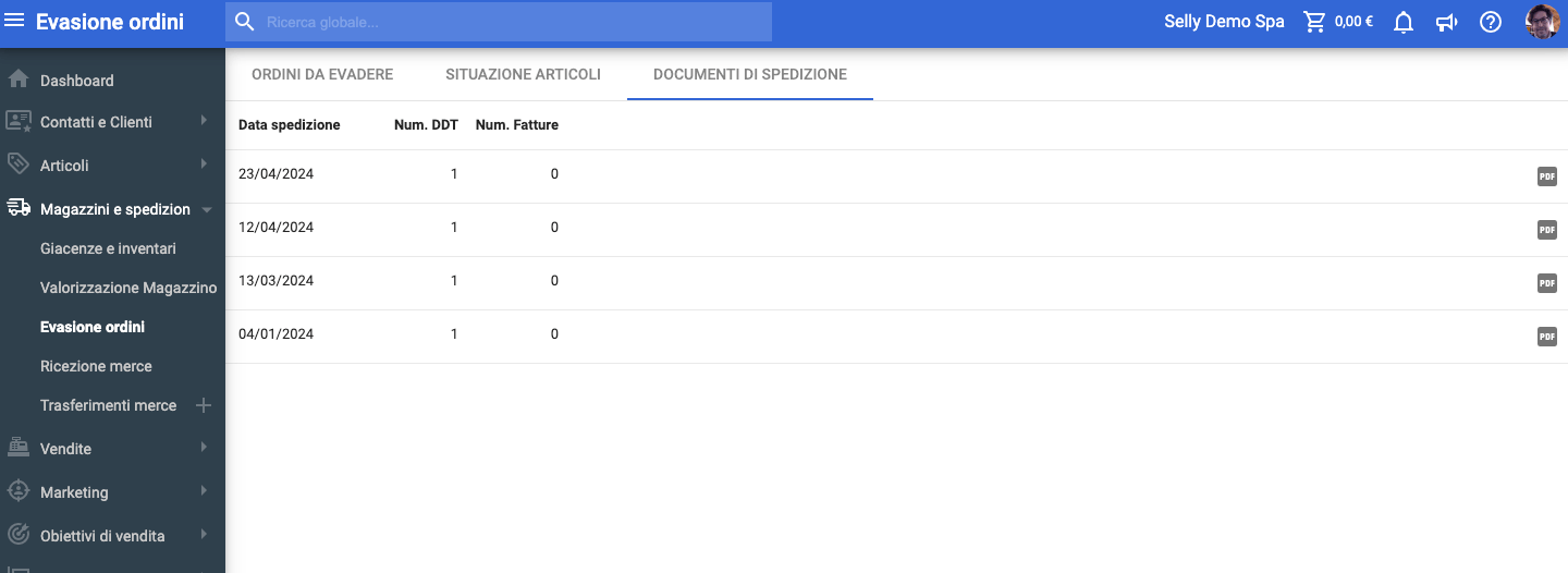 Una volta eseguita la procedura di generazione dei documenti di spedizione (DDT o Fatture accompagnatorie), in questa sezione troveremo tutti i documenti generati. Cliccando sull'icona PDF sarà possibile visualizzare tutti i documenti e procedere con la stampa.