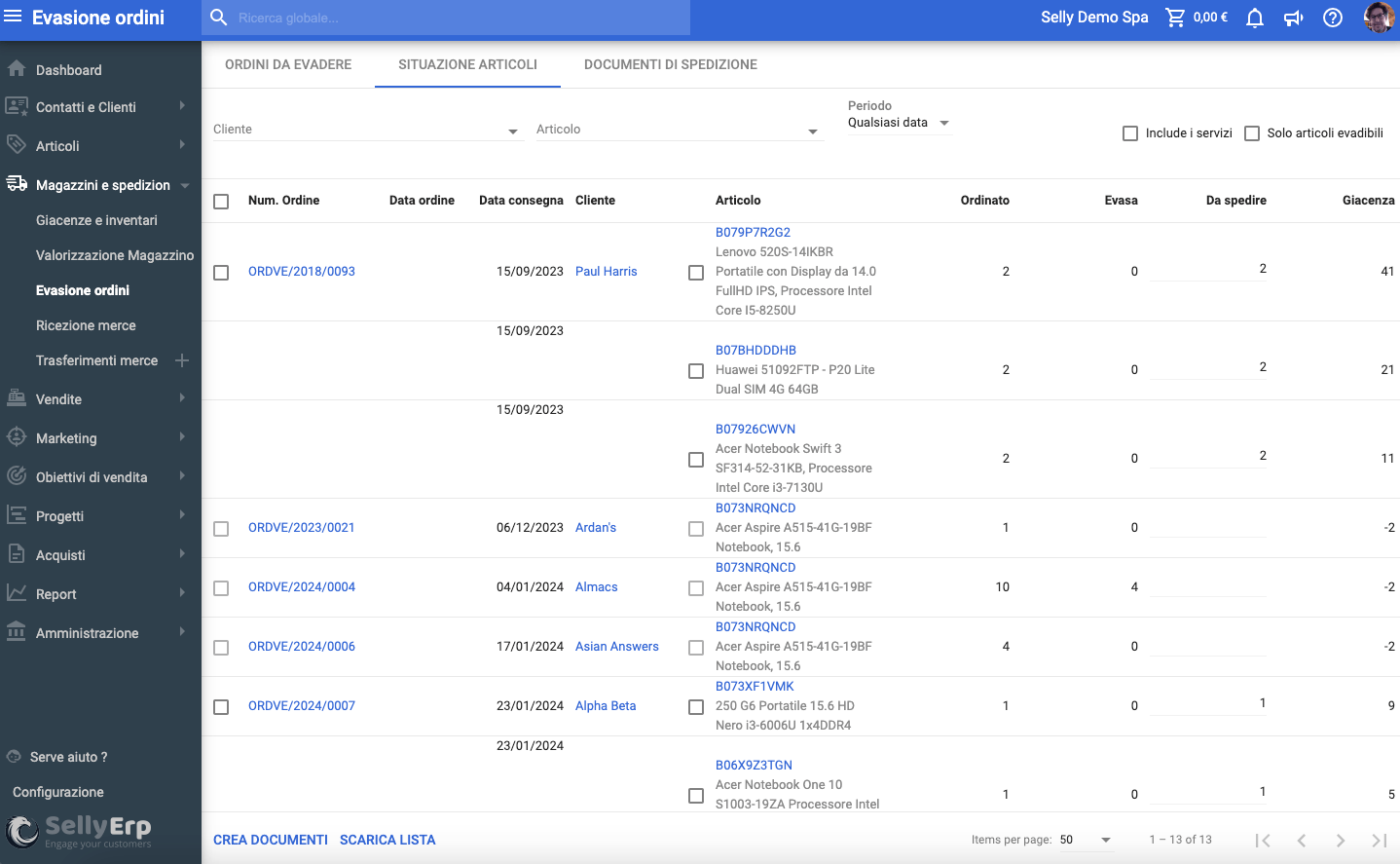 La sezione SITUAZIONE ARTICOLI consente la visualizzazione di tutti gli articoli presenti negli ordini di vendita da consegnare. E' possibile filtrare i prodotti per cliente o per articolo e per periodo. Come in precedenza è possibile spuntare la casella "Solo articoli evadibili" per visualizzare solo i prodotti presenti a magazzino.