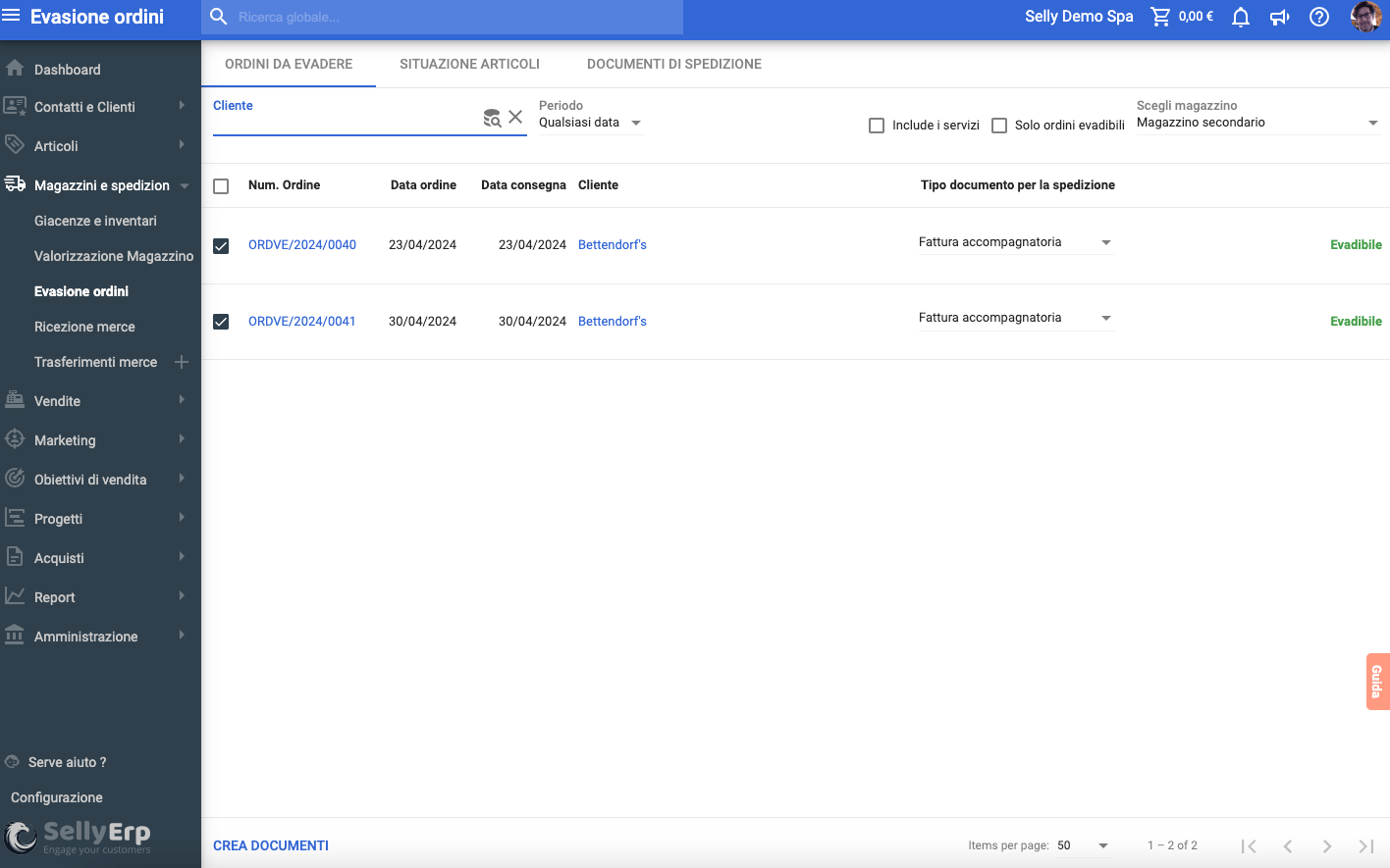 Per generare un unico documento di consegna (DDT o Fattura accompagnatoria) selezionare il cliente, impostare il tipo di documento che si desidera generare (es. fattura accompagnatoria) selezionare gli ordini e cliccare su CREA DOCUMENTI.