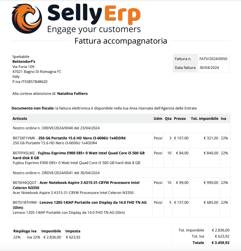 Verrà creato un'unico documento (es. fattura accompagnaoria) con i riferimenti ai 2 ordini di vendita.