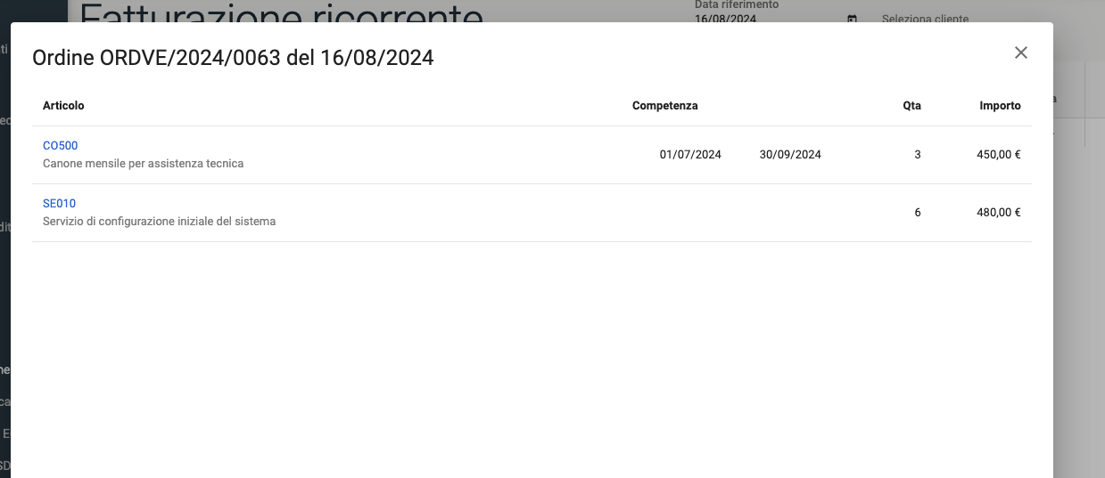 Nel caso dell'esempio fatto in questa guida, il servizio ricorrente indicato nella prima fatturazione, prevedeva il periodo 1/07/2024 al 30/09/2024. Impostando la data del 2/10/2024, il sistema propone la creazione delle fattura per il periodo 1/10/2024 - 31/12/2024