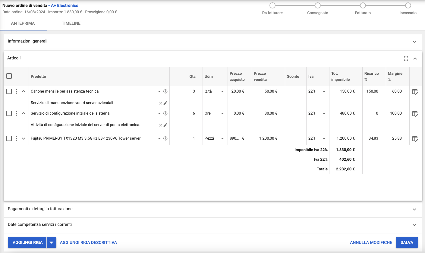 Ora cha abbiamo creato l'articolo, possiamo creare l'ordine di vendita e inserire l'articolo nelle righe del documento. Oltre all'articolo ricorrente, nel documento possiamo inserire anche altri servizi che prevedono una fatturazione una tantum.