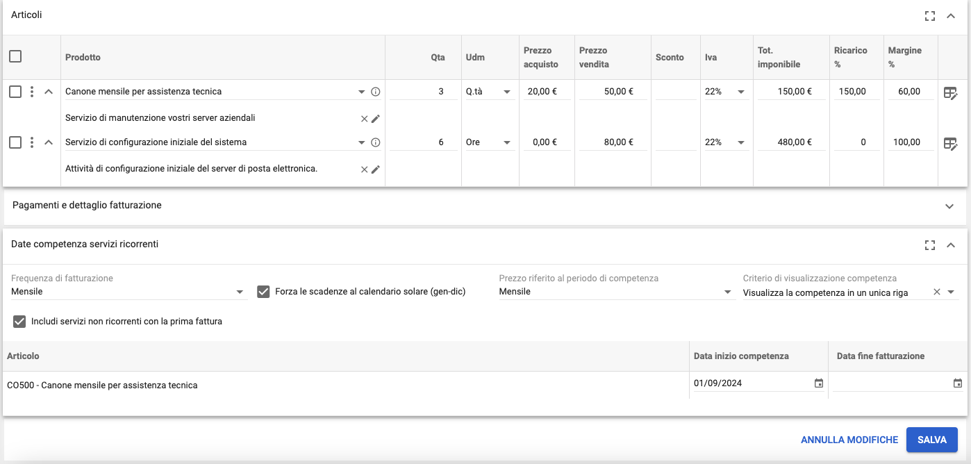 Come si vede, in questa fattura il sistema non ha inserito la riga del servizio di configurazione iniziale, in quanto era un servizio "una tantum".