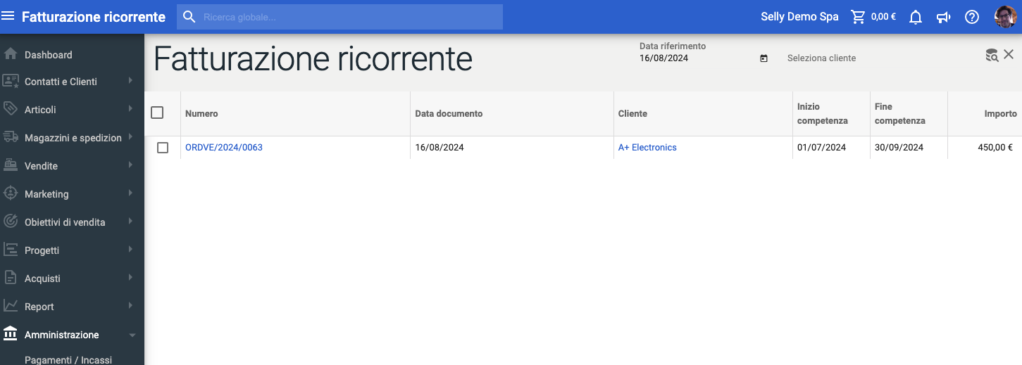 Impostando una data futura nella procedura di fatturazione ricorrente, sarà possibile visualizzare tutti gli ordini previsti per il periodo selezionato.