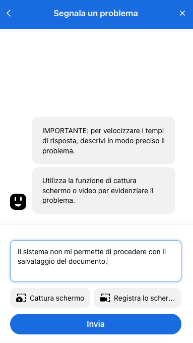 Selezionando questa opzione, la procedura richiede l'inserimento di una descrizione del problema, la possibilità di catturare una videata dell'applicazione (opzione Cattura schermo), oppure Registrare lo schermo (Video) evidenziando tutti i passaggi fatti e visualizzare l'errore.