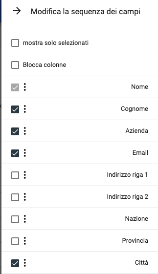 si aprirà il pannello dove selezionare le colonne da visualizzare e cliccando sui tre puntini adiacenti al nome della colonna, si potrà cambiare l'ordinamento.
